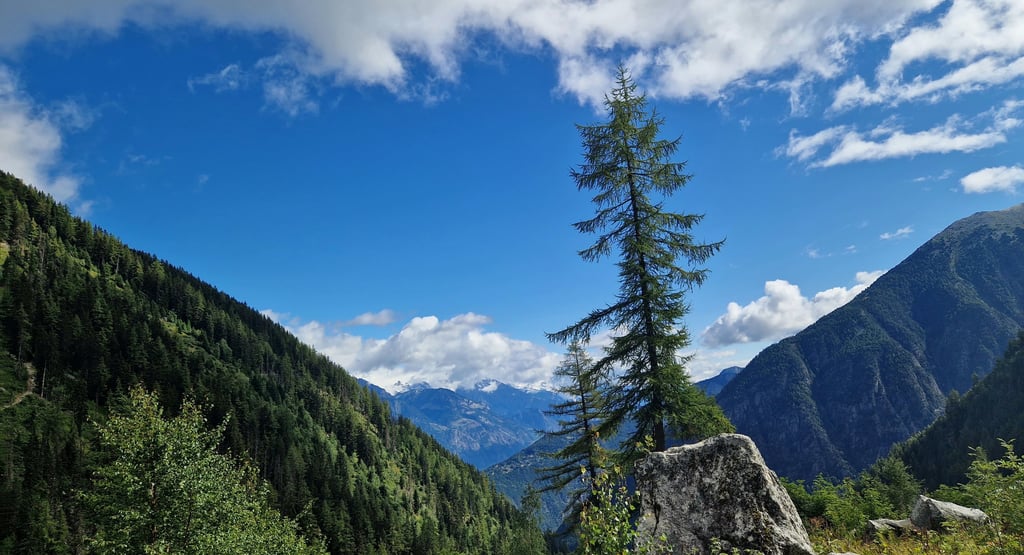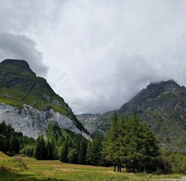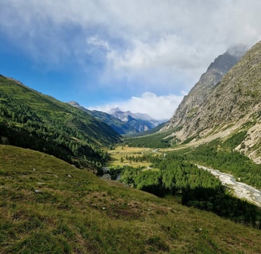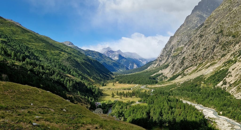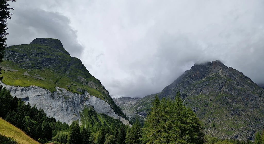 The walk from Forclaz to Trient was very calm and easy, so when we reached Trient, Tom and I decided to sit down for a drink near an official campsite. It was sunny, and in the valley, we enjoyed the sights of snowy and icy caps.