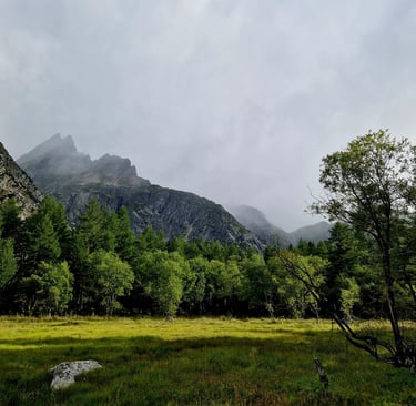 We started our trek around 7 AM. The day started out really nice, calm and cool as we descended to Lavachey. The trek from there to Rifugio Elena was relatively easy, surrounded by majestic mountains.
